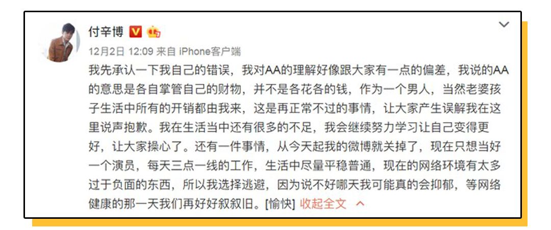 面對紛紛擾擾的聲音,搞得付辛博不得不回應此事。在微博發了一則長文澄清自己所說的 AA 制,是指各自管理自己的財務,而不是說,各花各自的錢。並且表明態度稱,「作為一個男人,婚後家庭和妻兒的開銷,理應是男人來承擔」。
