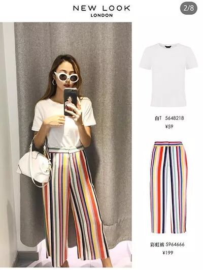 彩虹闊腿褲,表面上看起來十分難搭配,其實很好搭,夏天的話一件白T就可以搞定,早秋建議白襯衫或者白色針織衫。