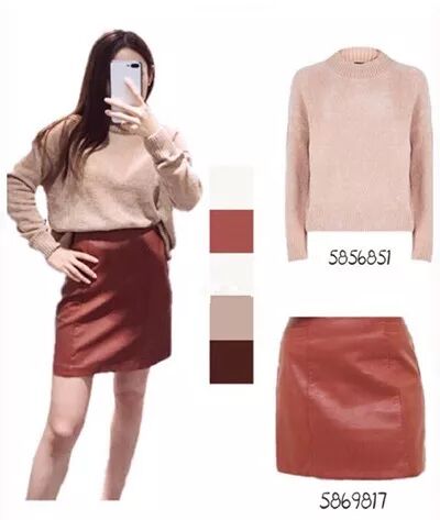 磚紅色A字PU半身裙和上衣很搭,很高級。可以展示你引以為傲的大長腿。