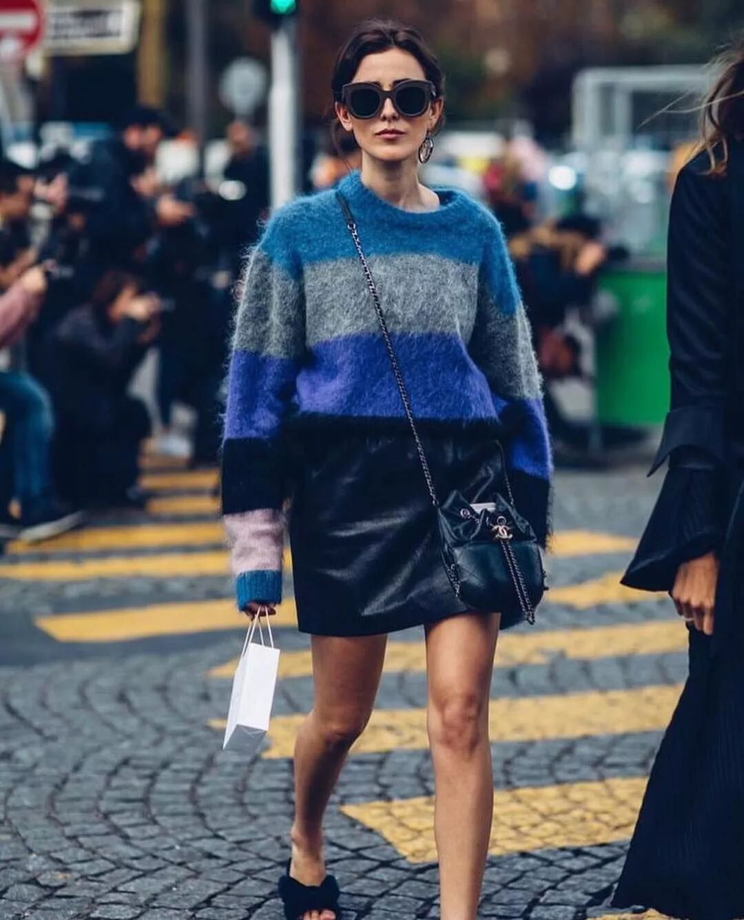 帽子、裙子、鞋和毛衫條紋的色彩色調一致。