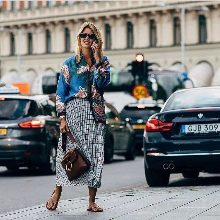 印花上衣+網格裙,衣邊和包包、鞋子的顏色一致。