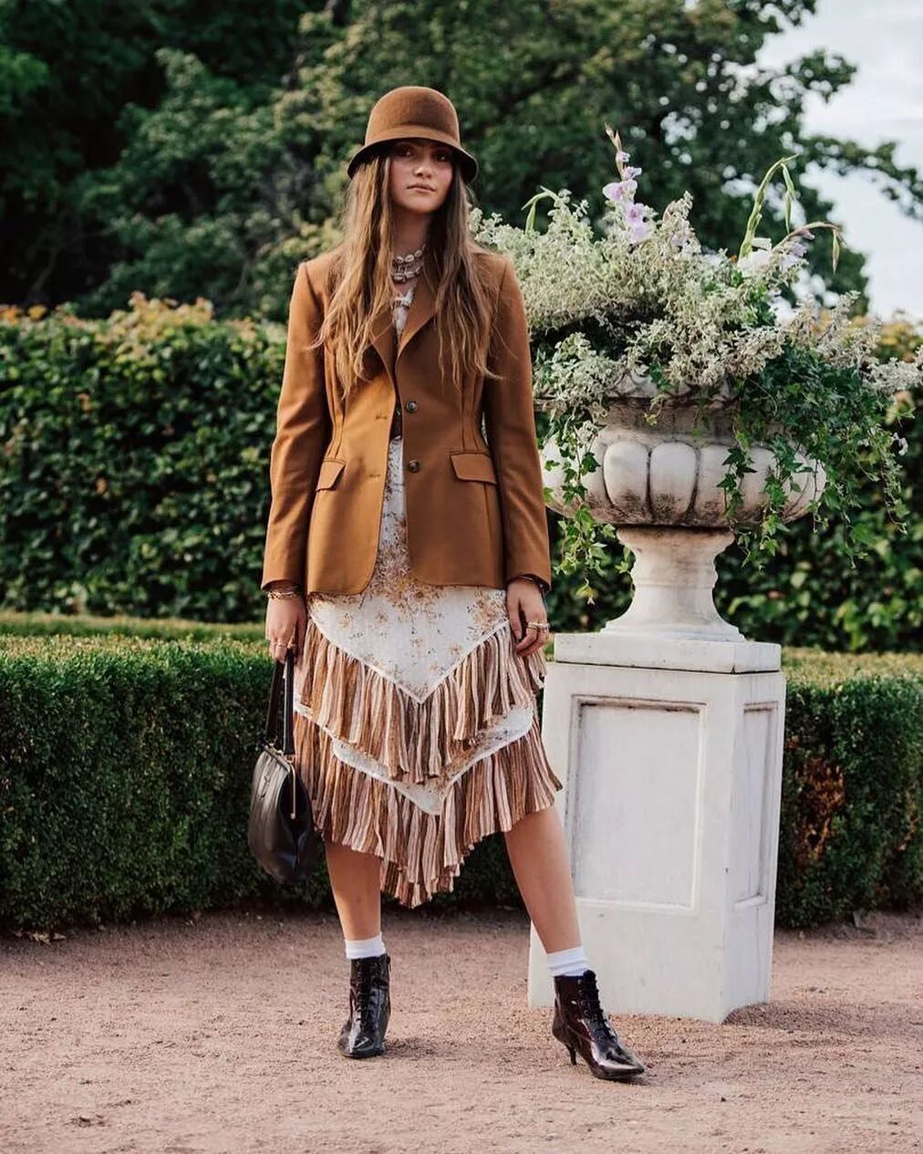 小西裝和帽子同色,很有英倫范,裙子的圖案和裙邊的色彩與上裝是同一色相,包包和鞋子相呼應,整體氣質硬朗帥氣而又不失女人味。