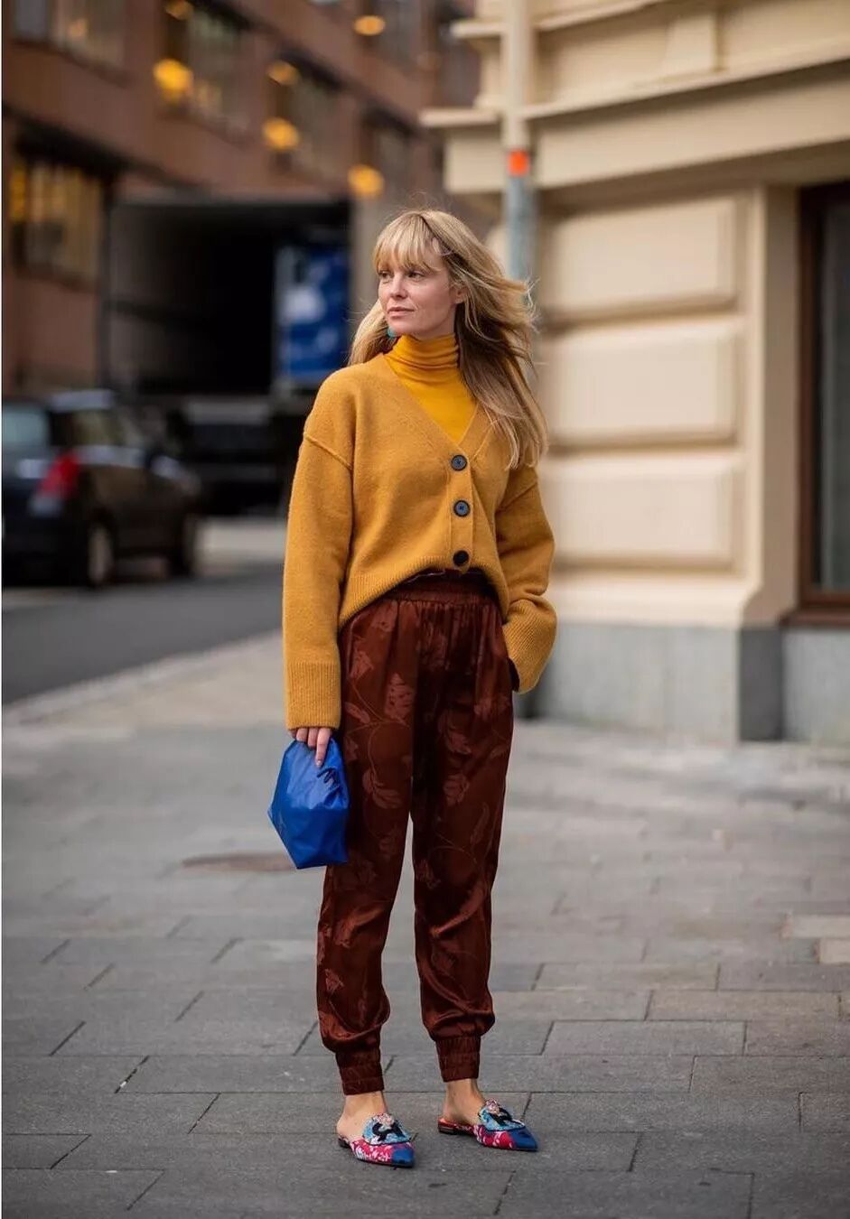 黃色+棕色,上裝包括兩種明度的黃,里面的明度高些,外面稍微暗色,搭出層次感。褲子和上裝在同一色系中。藍色印花鞋子和包包色彩相互呼應。