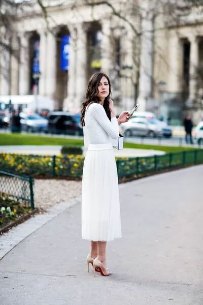白色上衣搭裸色紗裙,恬靜而爾雅。
