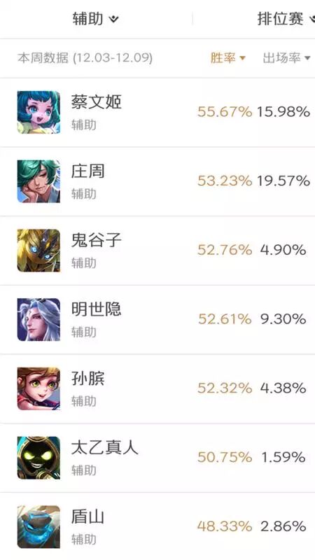 蔡文姬還是輔助里的NO.1,如果對面有一個蔡文姬,打團時站位太靠近就會被蔡文姬一直眩暈,非常討厭。另外莊周目前的出場率也比較高,可以克制很多強開型陣容。