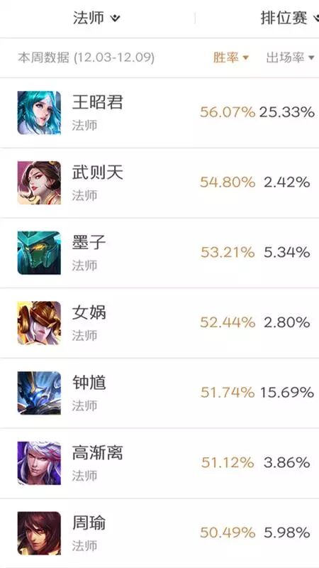 王昭君繼續排行第一,出場率也比較可觀,在星耀及以上很多玩家會選擇BAN掉。