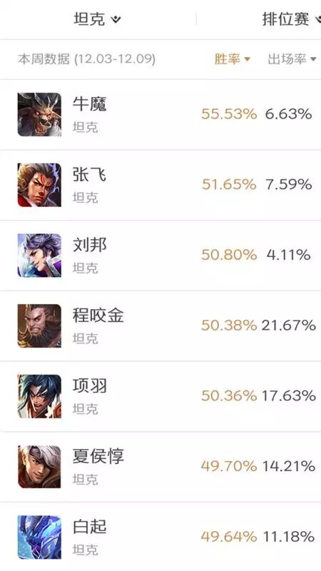 作為萬金油的牛魔勝率非常高,與第二名的勝率相差大概5個百分點。坦克榜排行前幾的英雄都是各有各的功能,能非常好地搭配不同陣容。