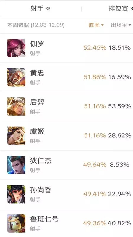 射手榜里除了虞姬和孫尚香都屬於站擼型射手,虞姬介於站擼型與技能型之間。孫尚香經過調整後勝率來到49.41%,但是在團戰的作用上依舊不如伽羅黃忠。