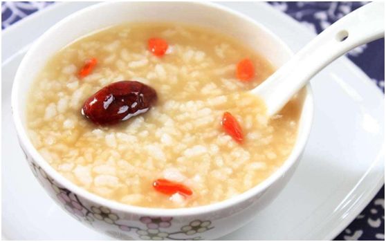 紅棗枸杞小米粥——小米、紅棗、枸杞、黃糖各適量先將紅棗和小米浸泡在水中一段時間,紅棗洗淨去核,然後在鍋中倒入適量的水,放入小米煮開,再倒入紅棗和枸杞,熬煮5分鐘後加入黃糖煮化,並攪拌均勻。