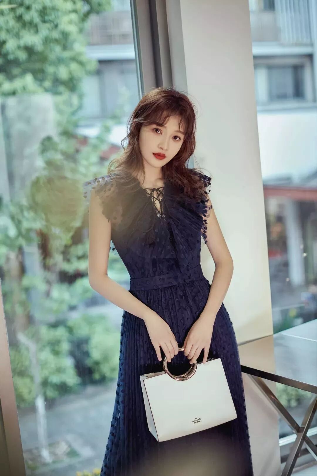 深藍色的蕾絲連衣裙、簡約的手袋,大波浪髮型,無不散發著有格調的精致女人味。