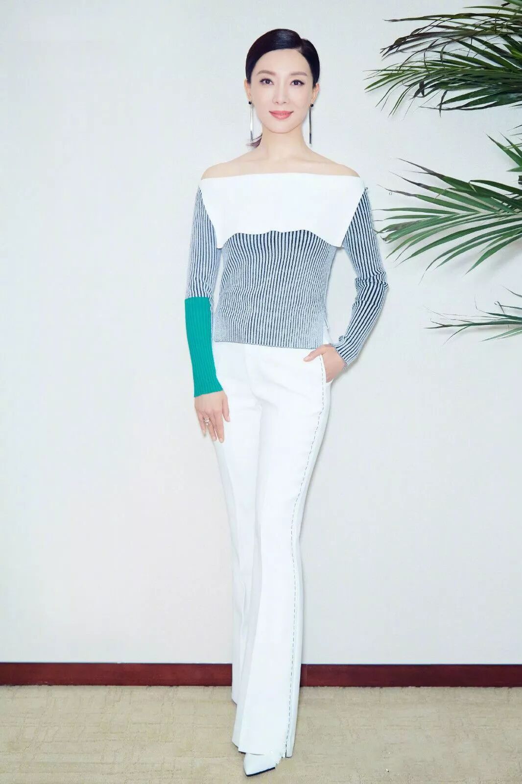 白色長款褲子,讓陳數秀出自己的美腿,長款的褲子,更加凸顯自己身材,搭配尖頭鞋子,拉伸美腿讓大家刮目相看。