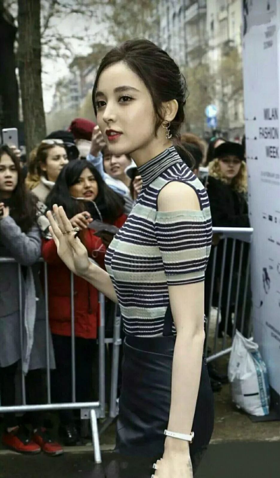 別看古力娜紮身材纖細,可人家上半身,還是很豐滿的,一條無袖設計的條紋上衣,緊身設計,多了幾分氣質,看起來誘惑力十足。