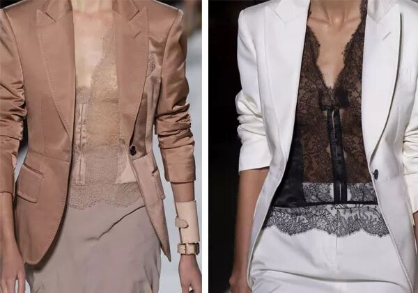 蕾絲在本季也頻繁出現,蕾絲的拼接內搭讓偏職場的西裝帶來若隱若現的性感氣息。