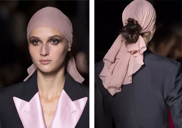 細節方面,頭巾絕對是本季最搶眼的配飾,80%的Look上都有它的身影。顏色選擇上也是非常豐富,黑色、淺粉色、淺米色、米白色,和服裝的色調一致,色彩飽和度低,帶有高級的顏色屬性。