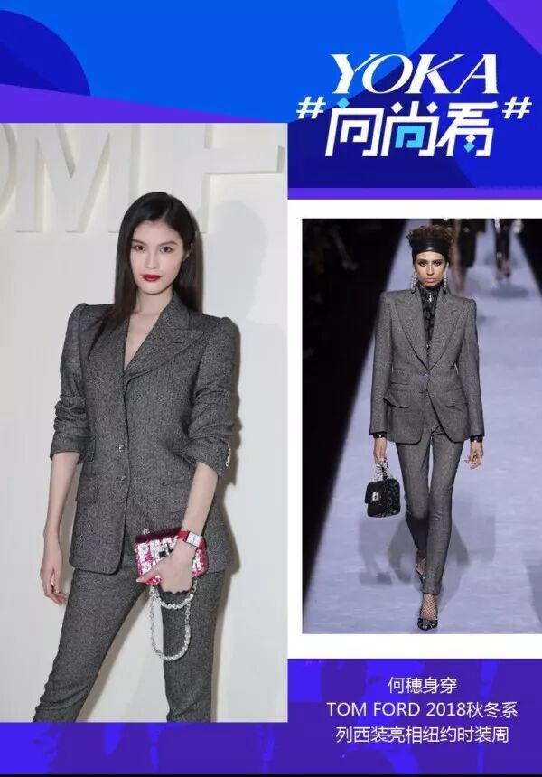 仙姑何穗這一身就有更有大女人風,帥氣的灰色西服套裝幹練十足,手拿包更添一份精致,加之性感紅唇,同樣驚艷全場。