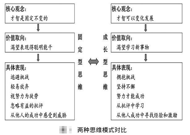 Dweck教授把這兩種態度歸於思維方式的差異,並稱這兩種思維方式為「固定式思維模式」和「成長型思維模式」。