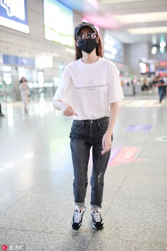 唐嫣這件白色T恤更加清爽,胸前簡簡單單的一行兩行英文字母足夠撐起整個造型的顏值了,搭配牛仔長褲和運動鞋,元氣滿滿,尤其適合夏季穿。
