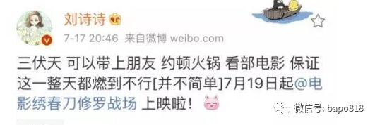 無緣演繡春刀2的劉詩詩大方給電影做了廣告。