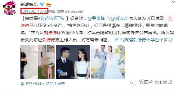 12月20日下午一點多,新浪轉載了台媒的爆料,推送了劉詩詩懷孕5個月的消息。