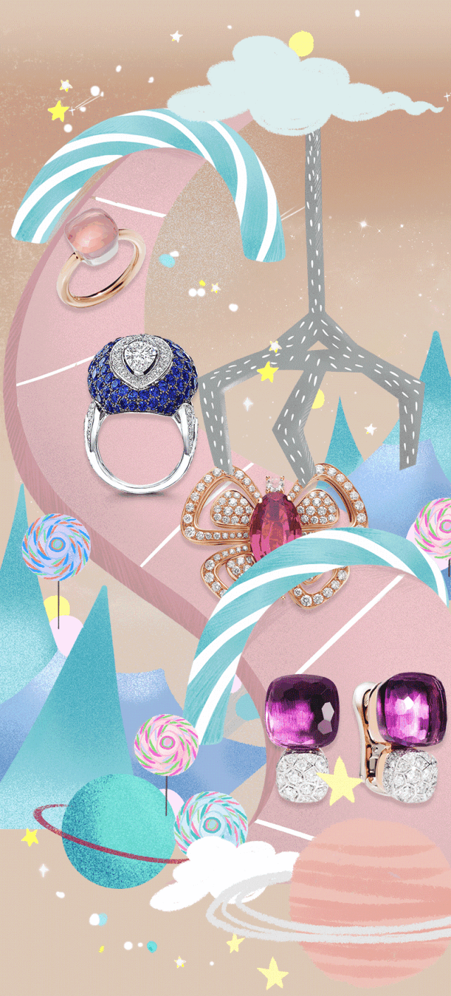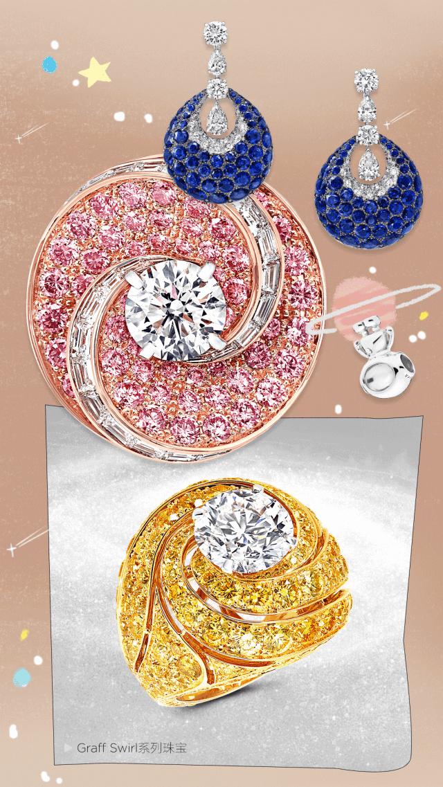 Graff的Swirl戒指、Bombé耳環也很「糖果」,一個個都是圓滾滾、鮮亮亮的。每顆珍罕寶石由創造者們精挑細選,確保色澤濃艷一致,然後仔細鑲嵌於立體圓拱形鉑金鑲架,展現瑰麗寶石與美鑽的迷人對比。