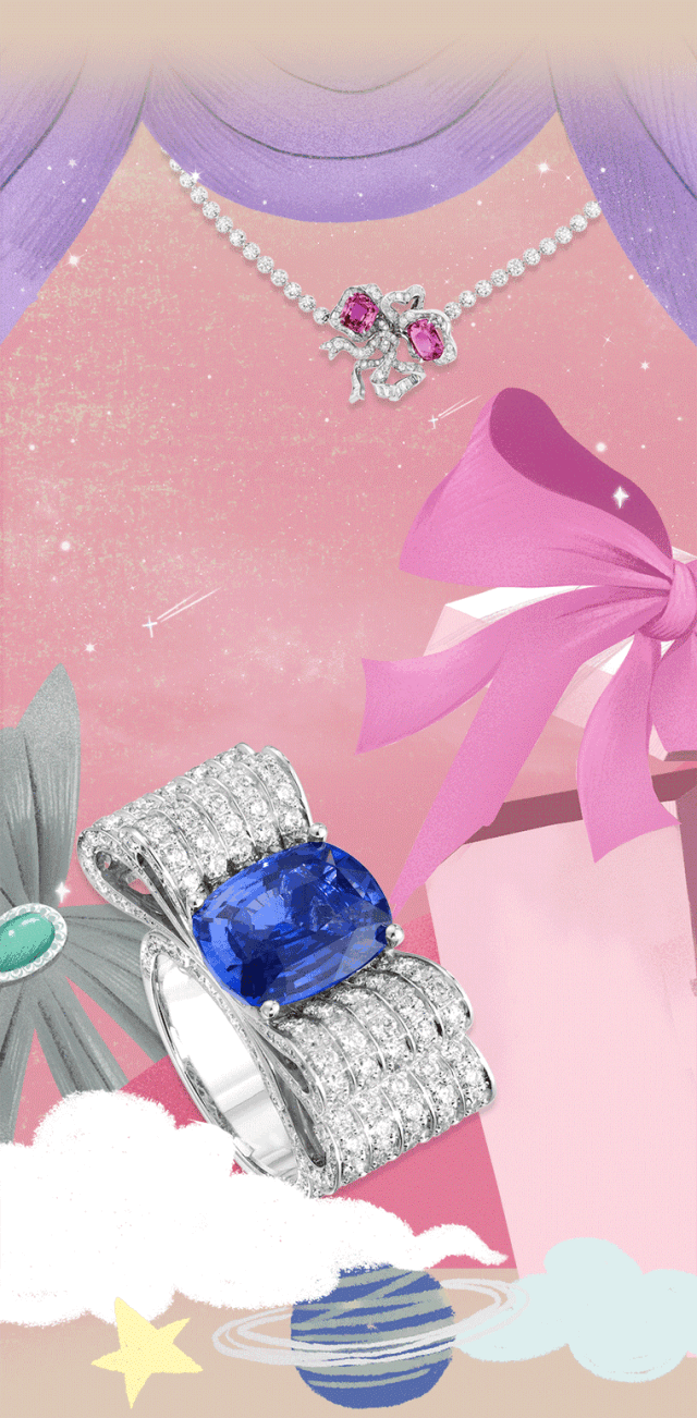 而在Dior頂級珠寶Dior à Versailles Salon L’Abondance系列里都是緞帶、蝴蝶結的身影,一眼就讓人聯想起宮廷禮服裙上的各種緞帶。