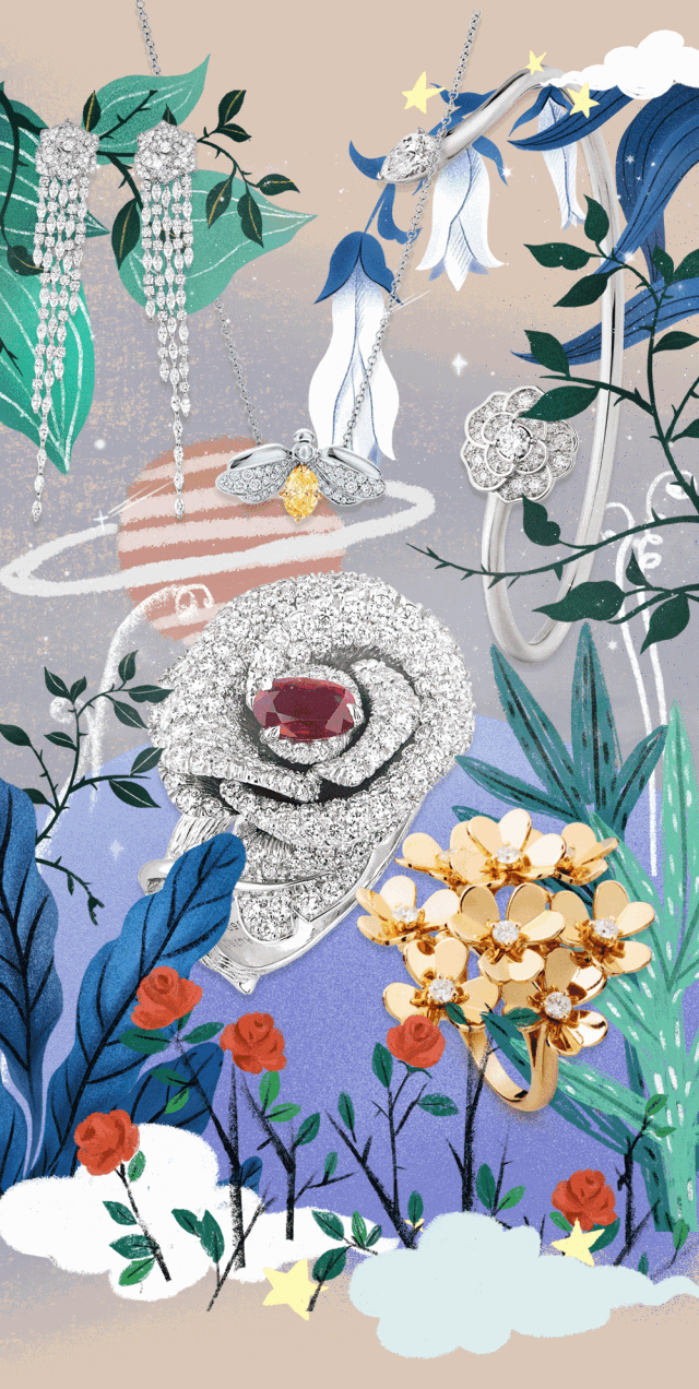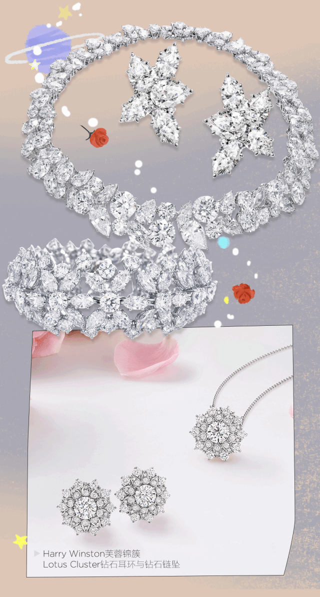 20世紀40年代12月的一個夜晚,就像現在一樣。海瑞·溫斯頓先生發現自家大門上懸掛著冬青枝葉編成的聖誕花環,一層一層晶瑩的冬季寒霜包裹著葉片閃閃發光。這一情景啟發了他開始思考如何讓鑽石主導設計,故而有了之後獨特而具代表性的設計——Cluster錦簇鑲嵌設計:將不同切工形狀的鑽石或寶石以不同角度緊密地鑲嵌在一起,打造出花朵的立體感,無論從哪個角度欣賞都散發超乎想像的燦爛和優雅光輝。百合、芙蓉、勿忘我……鑽石花海在溫斯頓花園中縱情綻放。