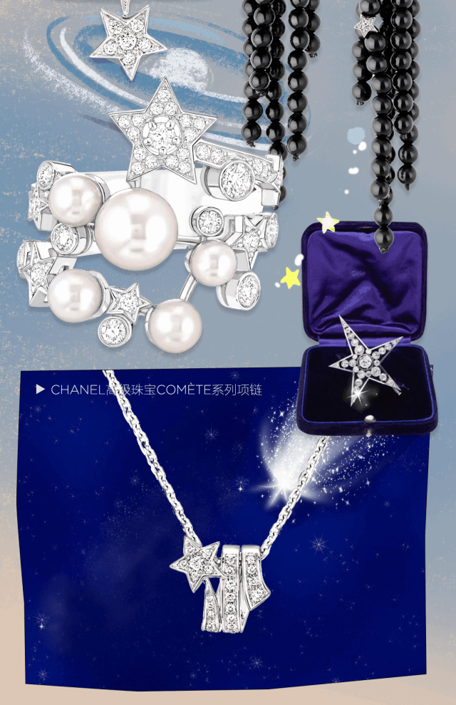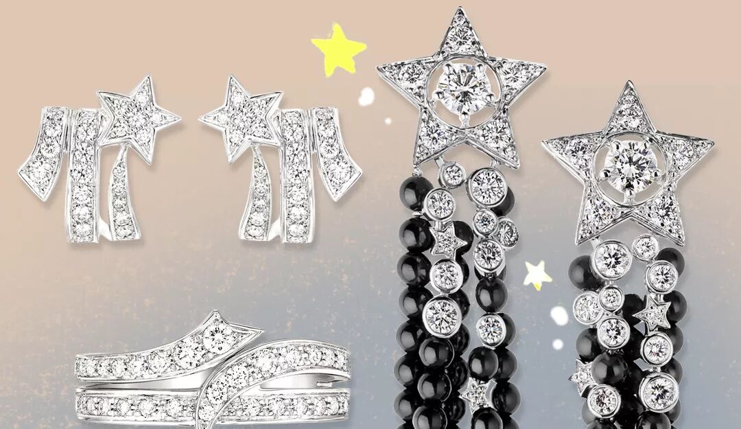 「流星」、「幸運」、「星星」,不難讓我想到了另一位大師——香奈兒女士。1932年,在那個具有劃時代意義的鑽石珠寶展上,她的鑽石設計取材於星空,不對稱的星星,是耳環的設計,一彎彗星光芒的弧線,環繞粉頸……在此之後,星星便成了香奈兒最為重要的設計元素之一。
