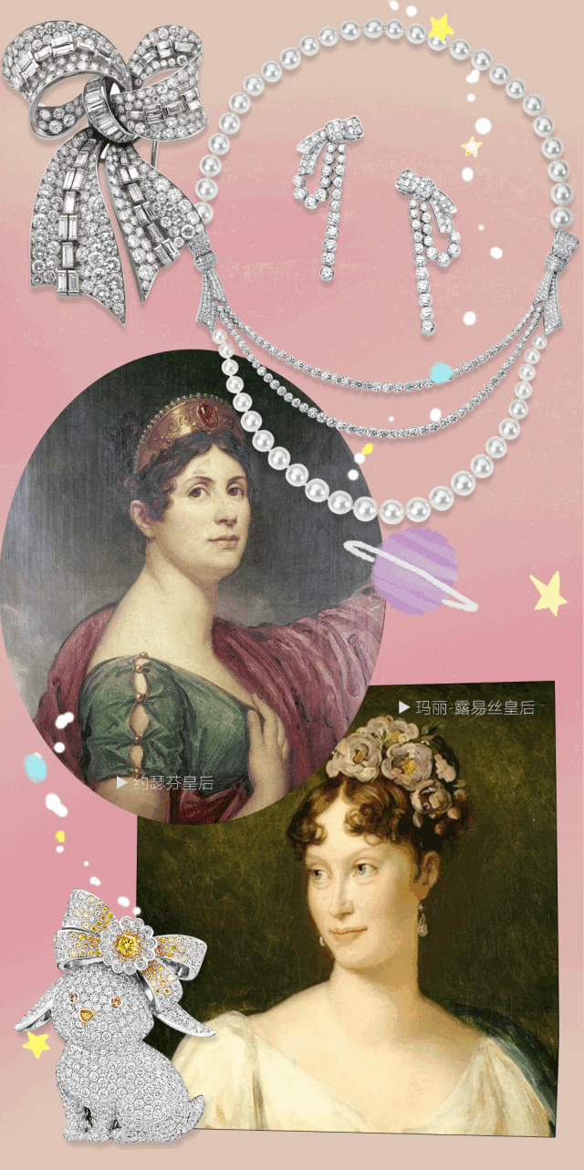 從文藝復興到19世紀的許多畫作中,常見描繪歐洲王室成員佩戴著模仿紡織品樣貌的珠寶,而高級珠寶品牌深受這些珠寶飾品與其代表的獨特優雅姿態所啟發。以風格化的絲帶、渦螺、卷軸、扇子或蝴蝶結,勾勒出鑲滿鑽石的精美飾品,有時候則鑲嵌以紅寶石或藍寶石,增添畫龍點睛的效果。