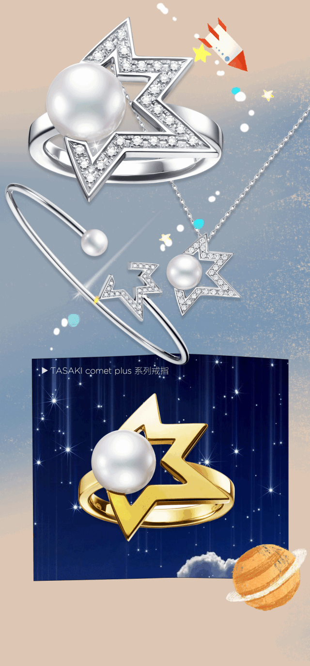 對了,還有珍珠和美麗星星的相遇,造就了TASAKI Pearly Star珍星假日系列。這一系列柔美珍珠與璀璨鑽石在夜色襯托下交相呼應,不規則幾何星造型別致而又獨特,猶如午夜時分從天際灑落的瑰麗珍寶,灑下漫天飛舞的璀璨光芒。啊……我都心動了!