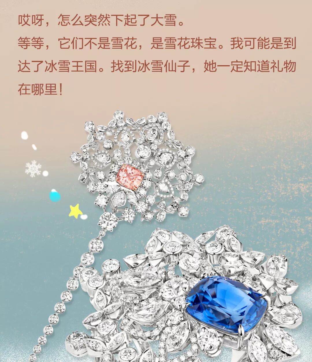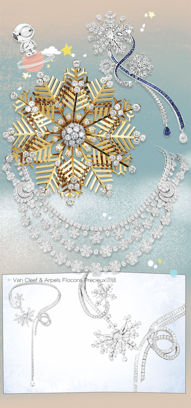 望著漫天飛舞的雪花一片一片毫無規律地落在地面,突然,發現了梵克雅寶冰雪仙子的身影,在她周邊圍繞的是Flocons Precieux系列珠寶……自1940年代問世以來,梵克雅寶於數十年間不斷演繹「雪花」圖案。