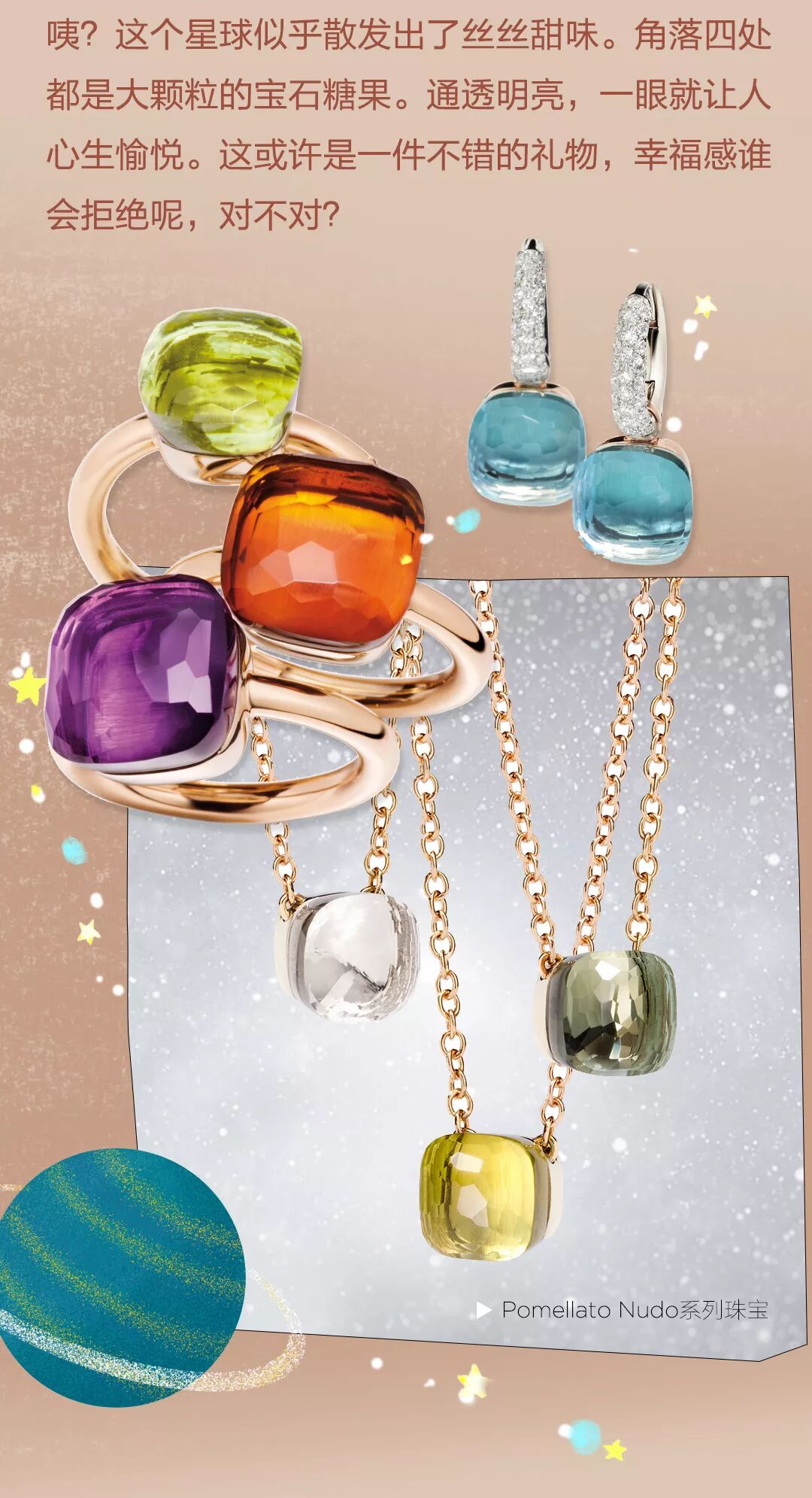 這顆名為Nudo的「糖果」來自義大利Pomellato ,Nudo系列是對傳統「單顆寶石戒指」的當代解讀。海藍寶、橄欖石、多彩的托帕石……真是一個個透明的小可愛!