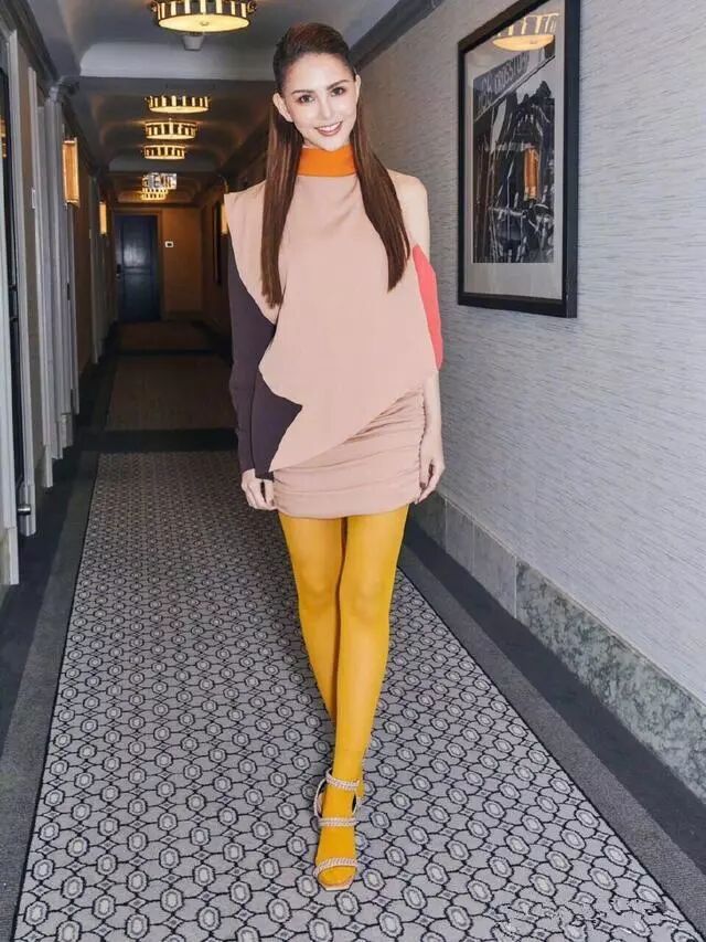 昆凌怎麼說也是模特出身,一件拼色的寬鬆連衣裙,再搭配一條橙黃色的打底褲,顏色上很亮眼,但是腳上得這雙鞋子就有點不協調了。
