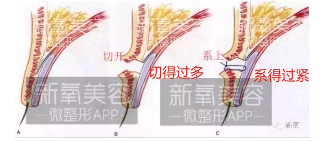 二:組織切除過多。組織去除得多,而上下部位是沒有切除的,你們腦補下中間少了,是不是很輕鬆的系上?沒有切的部位被翻起,是不是越發顯得中間系緊了,深深的折疊感是不是出來了?(可類比溝壑,中間的溝變深)這也是肉條和凹陷一般不分家的一部分原因。