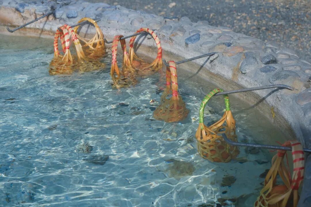 8塊人民幣就可以買一小筐雞蛋或者鵪鶉蛋,然後拿到滾燙的溫泉里煮,公園還特別貼心的安裝了掛籃子的掛鉤,蛋均勻受熱,方便取用。