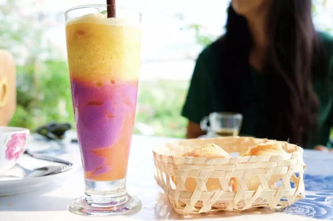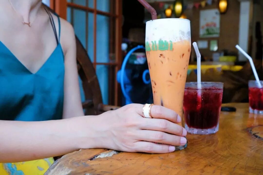 寶藏女孩兒還為我們點了這里的招牌特飲,說這里的泰式奶茶在當地很出名,遊客來泰國一般都找手標泰茶喝,但手標茶是類似於街邊奶茶店的快消奶茶,茶葉的品質不好,這家用的是茶是泰國傳統百年老茶廠的茶,做出來的奶茶口感更好,茶味更濃鬱,是更地道的泰式奶茶味道。