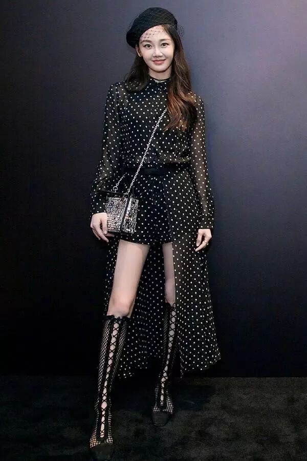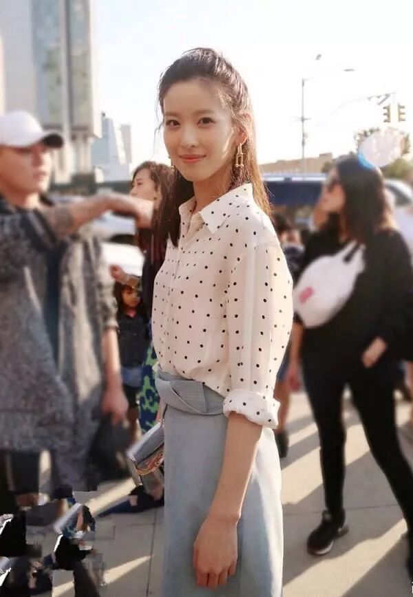 波點元素十分流行,很多女星都愛不釋手,奶茶妹妹的白色波點,依然給大家小清新感覺,搭配高腰半身裙,美出新高度。