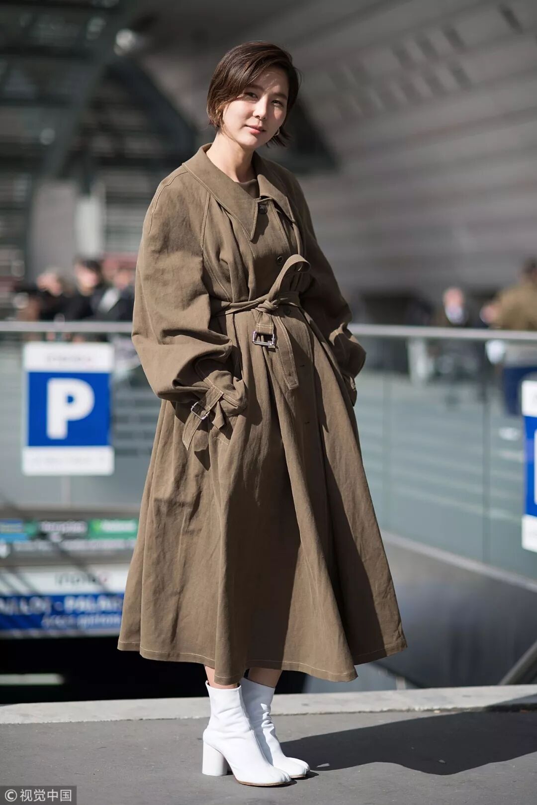 Margiela白色分趾高跟短靴,收腰的腰帶給這身文藝復古的造型增加了時尚分,也起到了拉長腰身的效果。