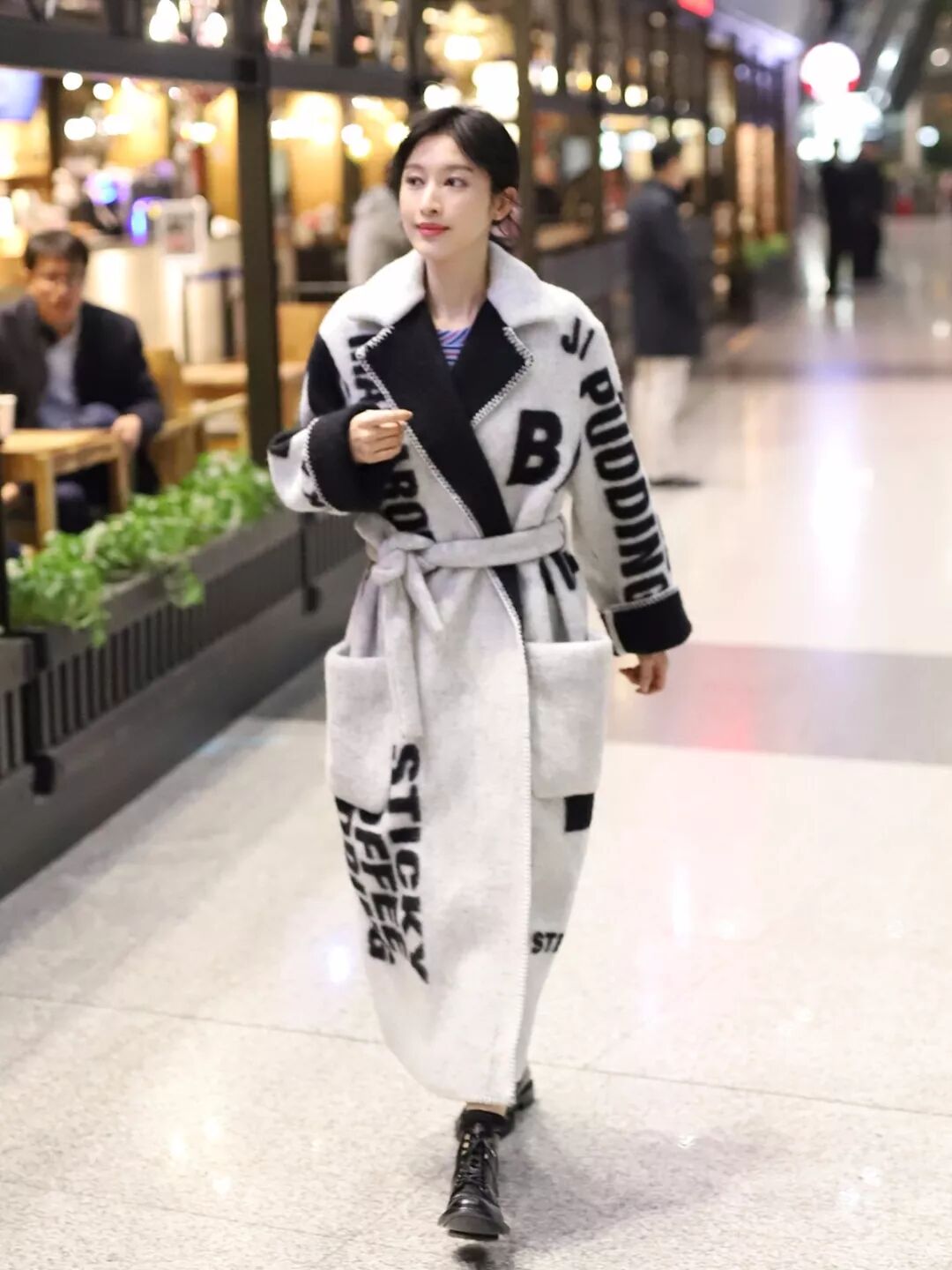 張儷身穿CELINE大衣,字母印花+鑲邊設計給這身黑白造型帶來時尚活力,腰帶收斂了造型的腫脹感,休閒的同時也不忘展示纖細腰圍,簡潔輕快的造型非常值得借鑒。