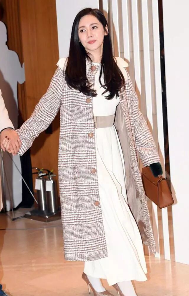 格子的大衣看起來非常的帥氣了,內搭的是白色的收腰的小長裙看起來特別淑女,金色的高跟鞋看起來很高貴的樣子