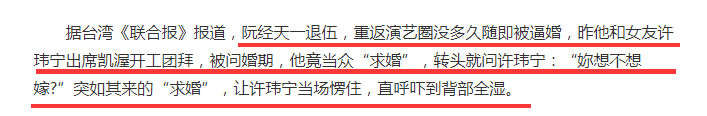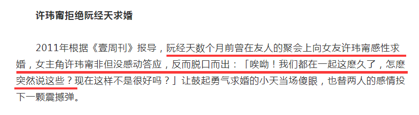 這麼說來阮經天根本不愛許瑋甯才對,事實上並不如此,在兩人戀愛的八年期間,阮經天就多次向許瑋甯求婚過,但每次都被拒絕,其中有一次還是阮經天在朋友聚會上向許瑋甯求婚,但許瑋甯立馬就拒絕了。