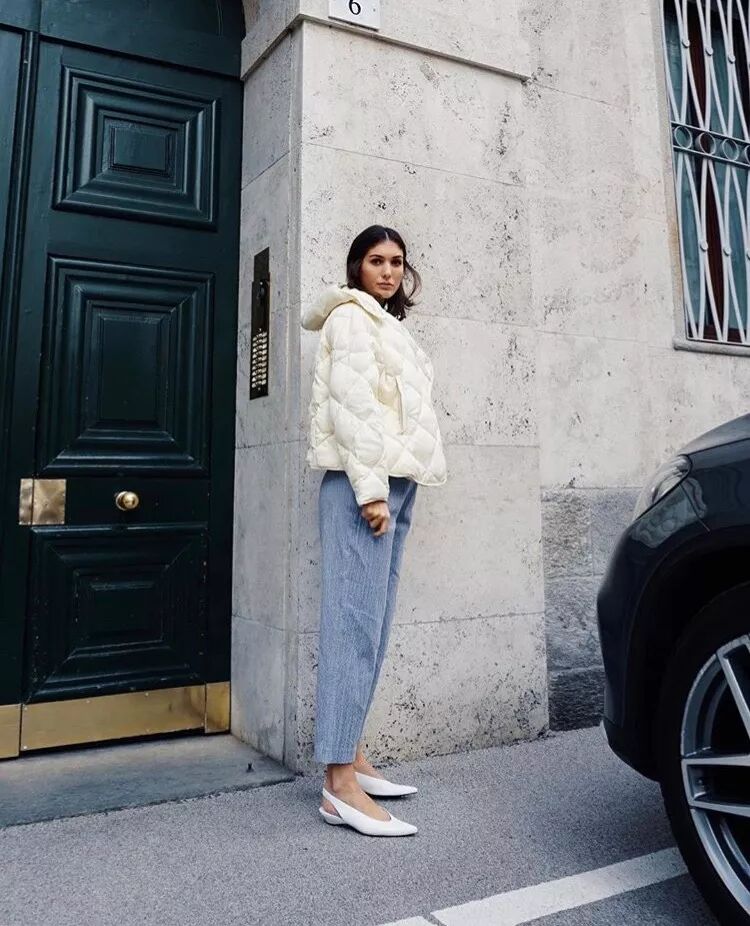 牛仔褲的百搭大法即使撞上白色羽絨服也能共通屬性,無論什麼樣的款式都能輕鬆match,哪怕是最不好相處的菱格紋都能化繁為簡,實在是姑娘們最不費腦力的選擇之一。