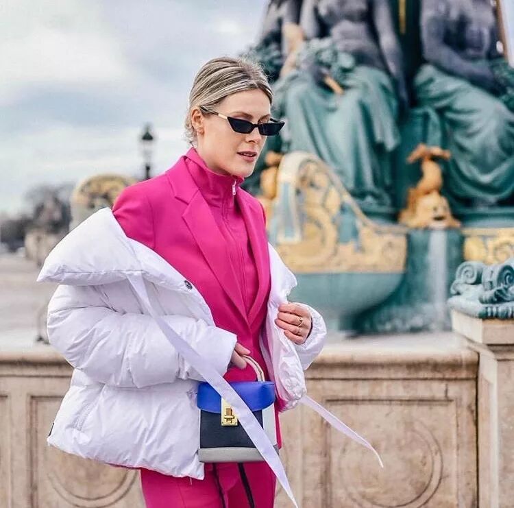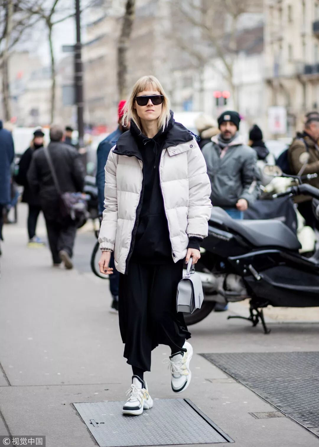廓形蓬鬆的白色麵包服搭配個性褲裝時,能夠適當拉長腰線比例,上松下緊的視覺效果協調了著裝整體,運動鞋的活力點睛讓look看起來更加青春洋溢。