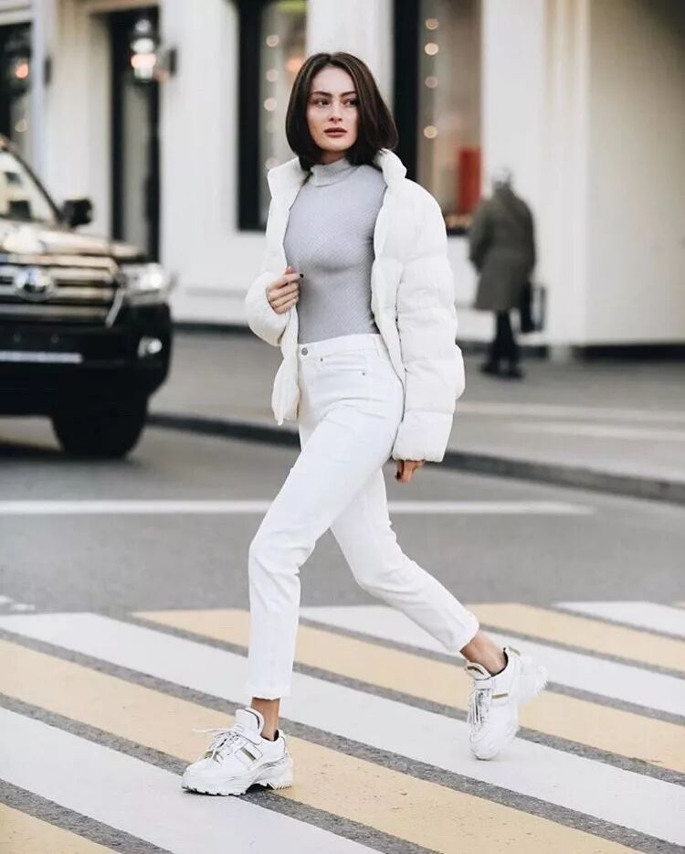 細腳牛仔褲的搭配乾淨利落,穿上舒適感滿分的球鞋助力,輕鬆化身清爽陽光的鄰家女孩,讓羽絨服也可以輕盈起來。