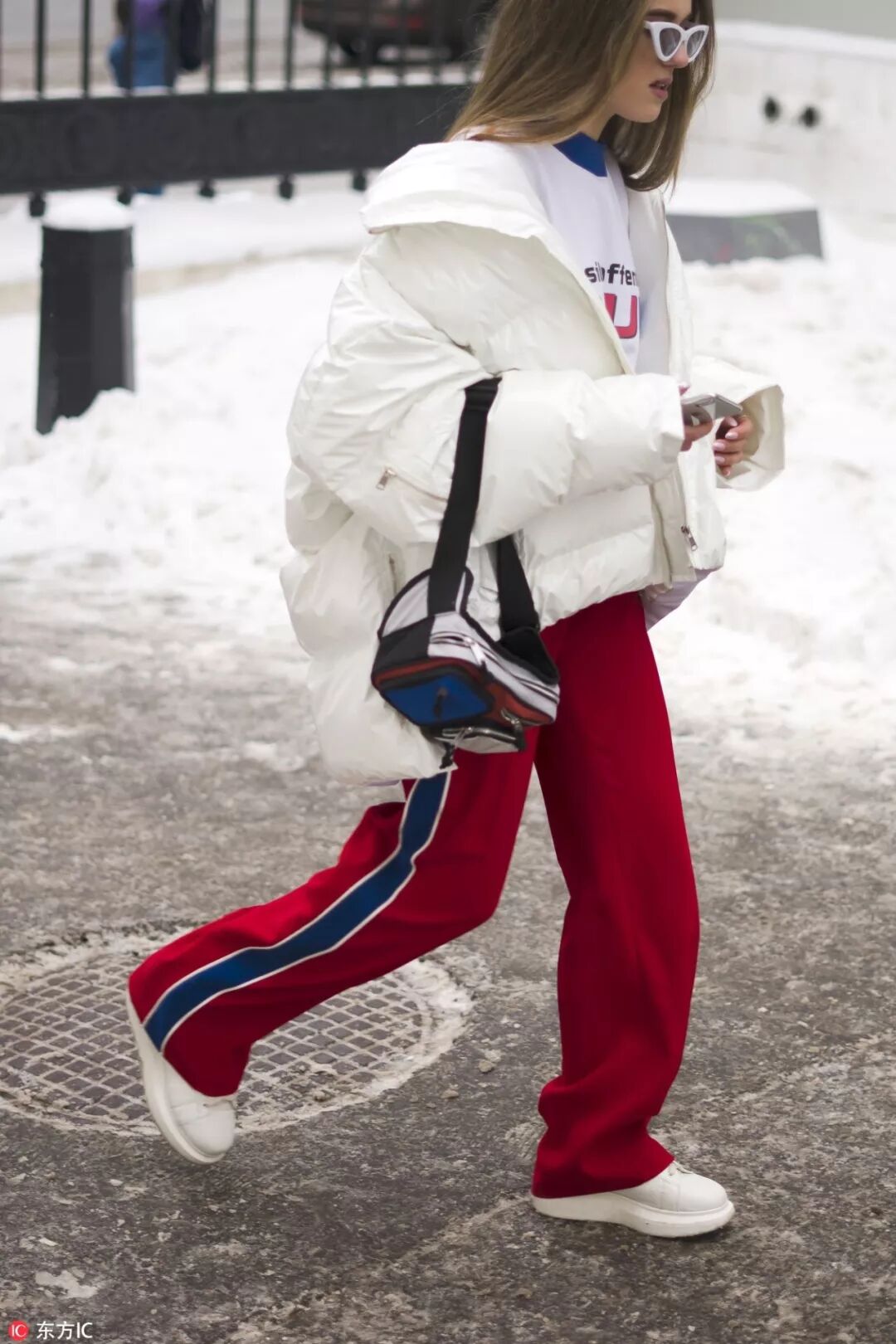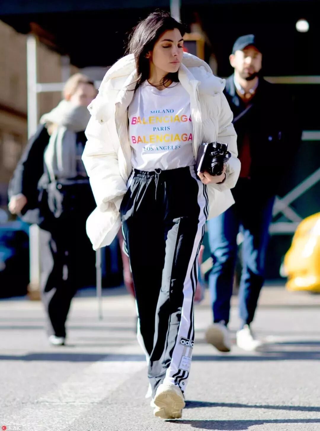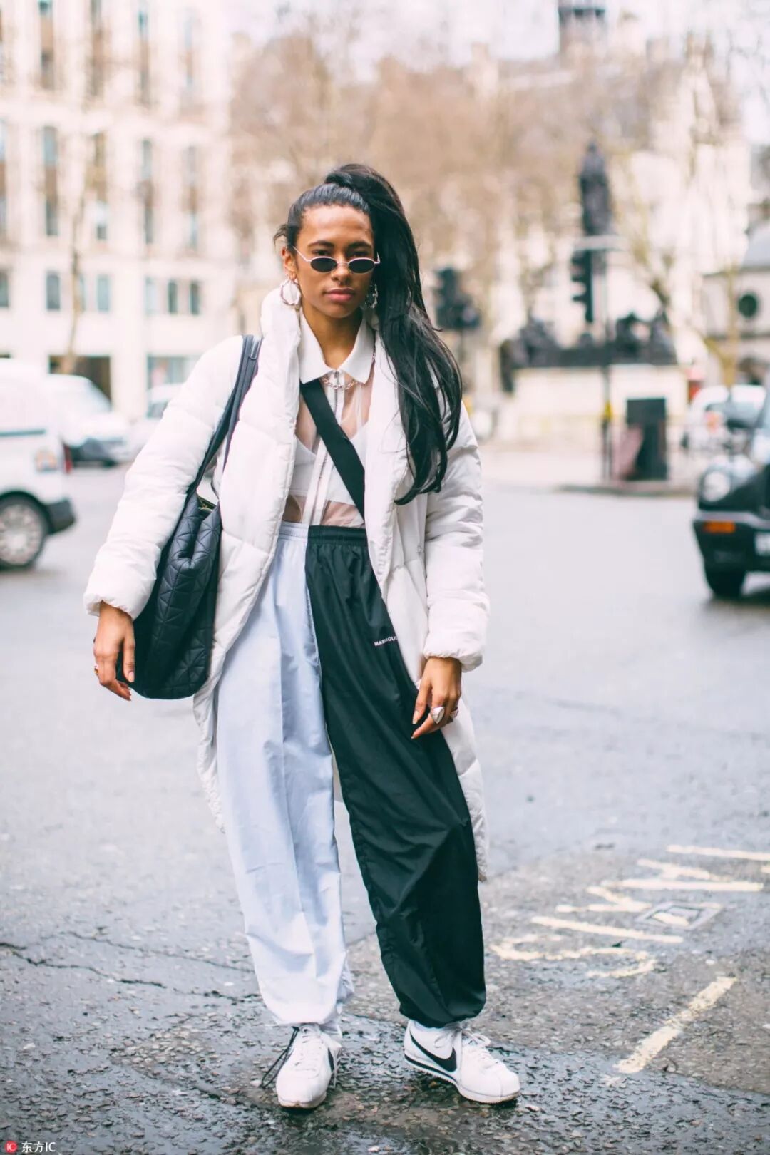 土酷風的大勢帶著校服褲一起回了潮,只是不敢想如此「運動」的條紋校服褲撞上白色羽絨服,竟然還能穿出一股復古的街頭氣息。