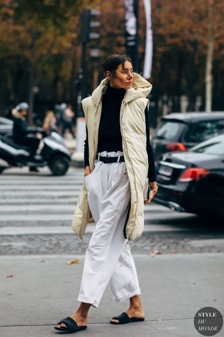 仙姑何穗白色挖肩羽絨服設計感十足,同色組合的無袖高領針織衫巧妙應景了上裝色調,Maison Margiela鐳射高跟靴彰顯風格摩登俏麗。