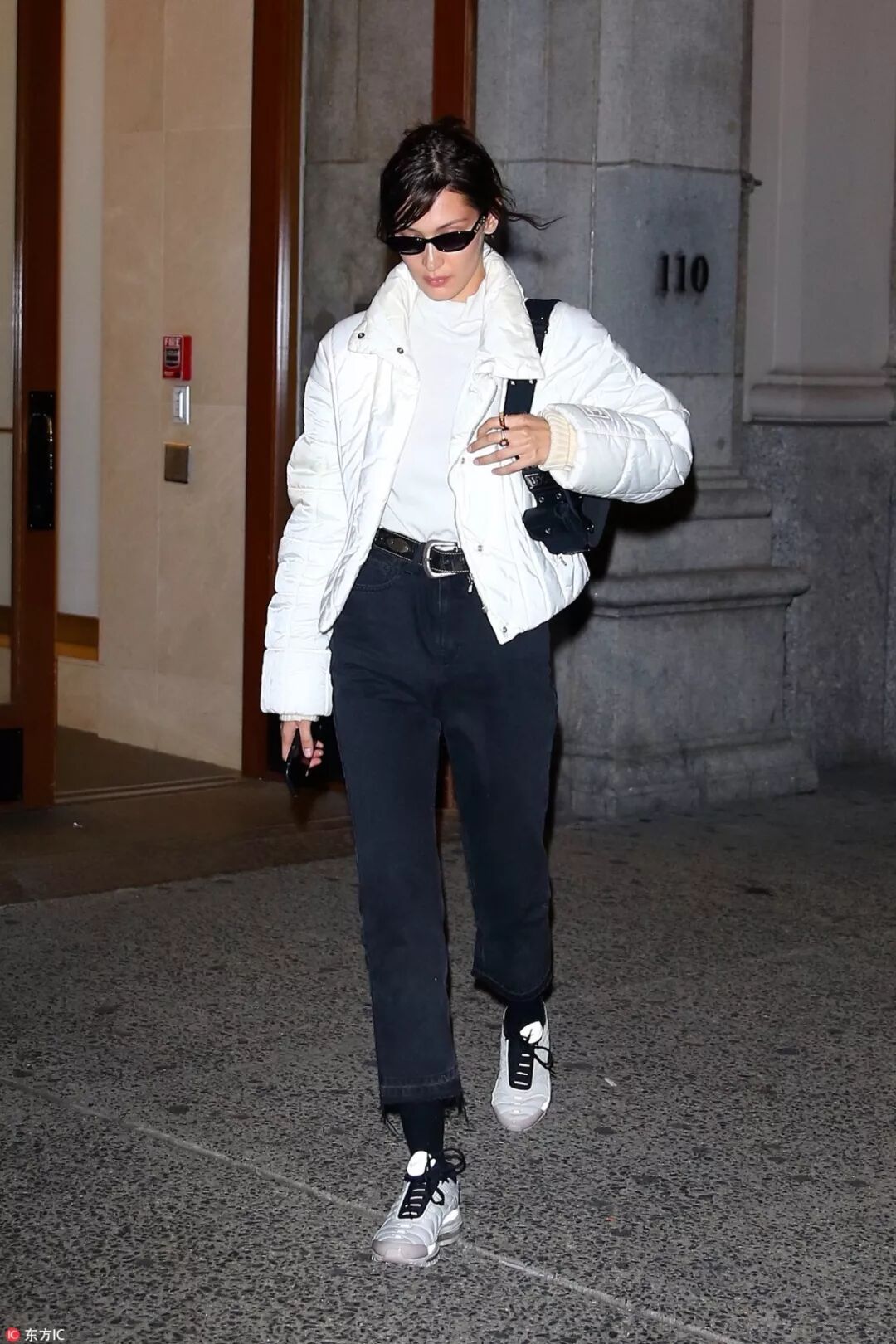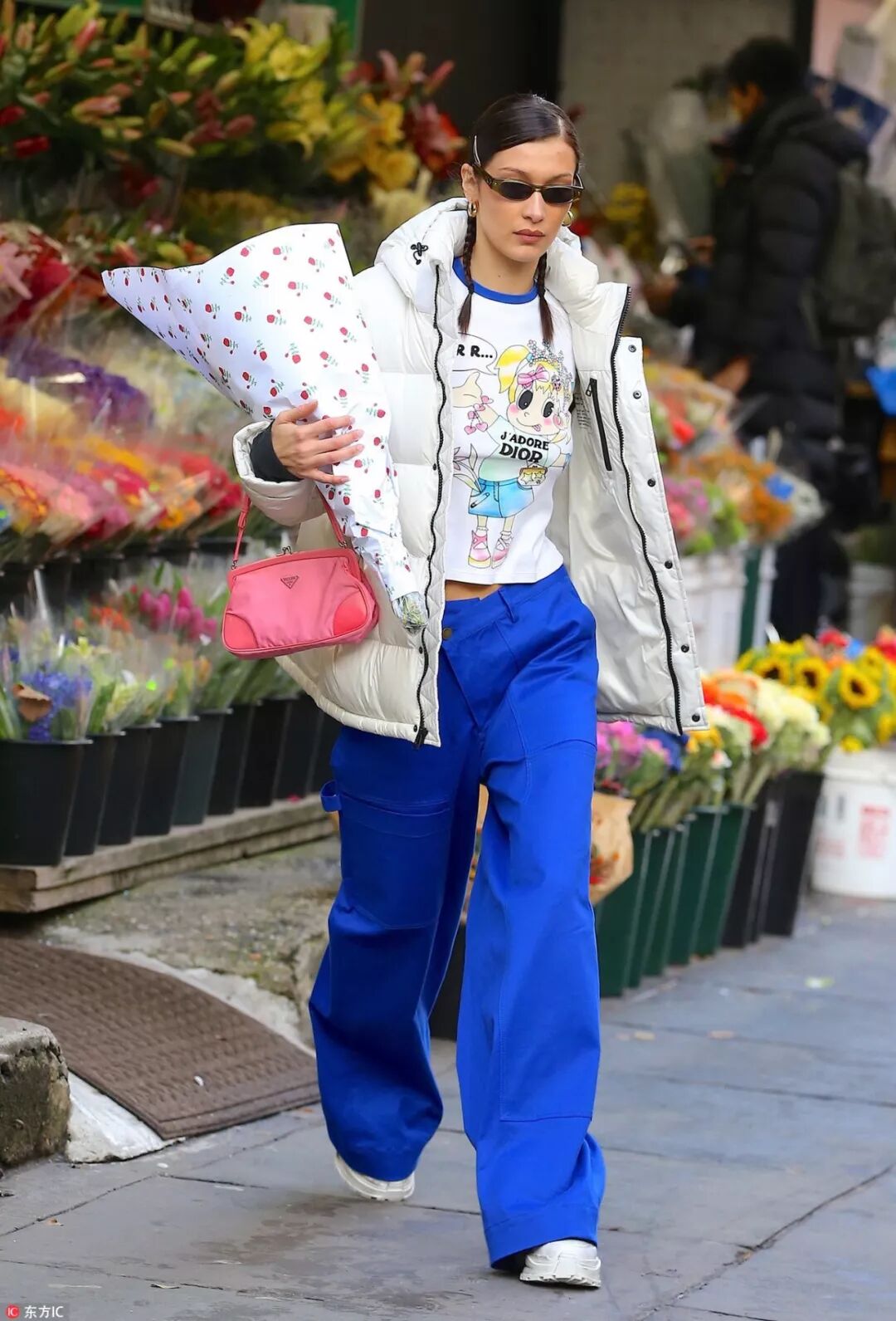 街潮本潮Bella Hadid買花路上也不忘穿上它時髦一把,Tna the Super白色羽絨服搭配Monse超長闊腿褲氣場兩米八,萌萌卡通Tee做內搭的妙思,保暖又不失著裝輕盈性。