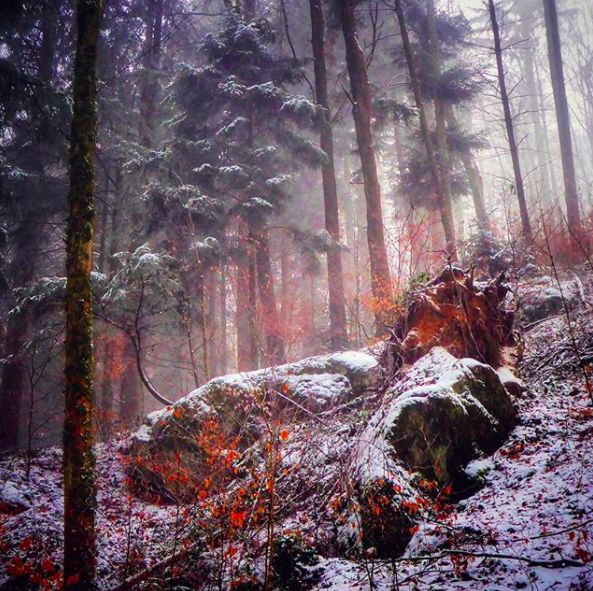 在多瑙河的源頭,綿延60多公里的山區中,密布著大片的德國針葉林。遠遠望去黑壓壓的一片,「黑森林」因而得名。這片森林仿佛天生就帶有著深刻的童話氣質,春天美麗的野花遍布,夏天高大的綠樹成蔭,秋天層林盡染,冬天白雪皚皚,《格林童話》的原型就在這里。