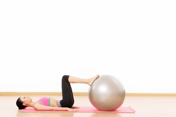 1 :仰臥在墊子上,雙臂置於身體兩側,雙腿屈膝成直角,雙腳置於健身球上;