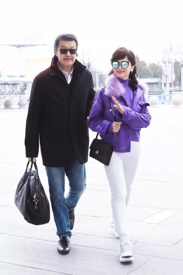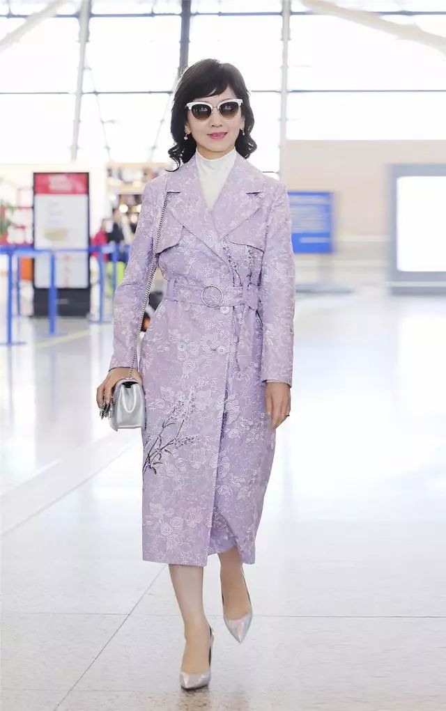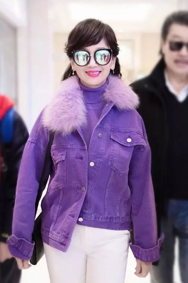 趙雅芝的髮型看起來卷卷的特別的時髦了,穿著一件紫色的外套內搭的也是紫色的衣服顯得很精致了,墨鏡看起來非常的帥氣