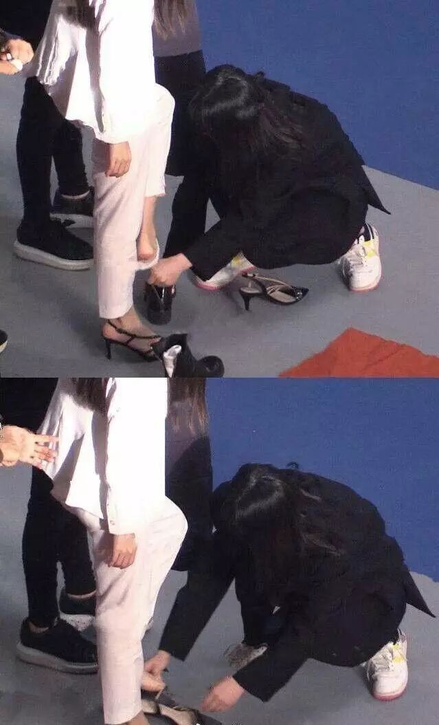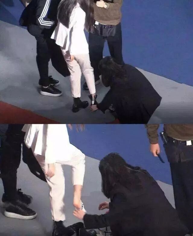 從照片上看,一群人圍著baby團團忙碌,而助理還要蹲在地上,幫她脫下襪子和靴子,再重新換上一雙高跟鞋,從頭到尾baby只是稍稍把腳抬起來,連彎腰都沒彎,被調侃為「公主架式」。